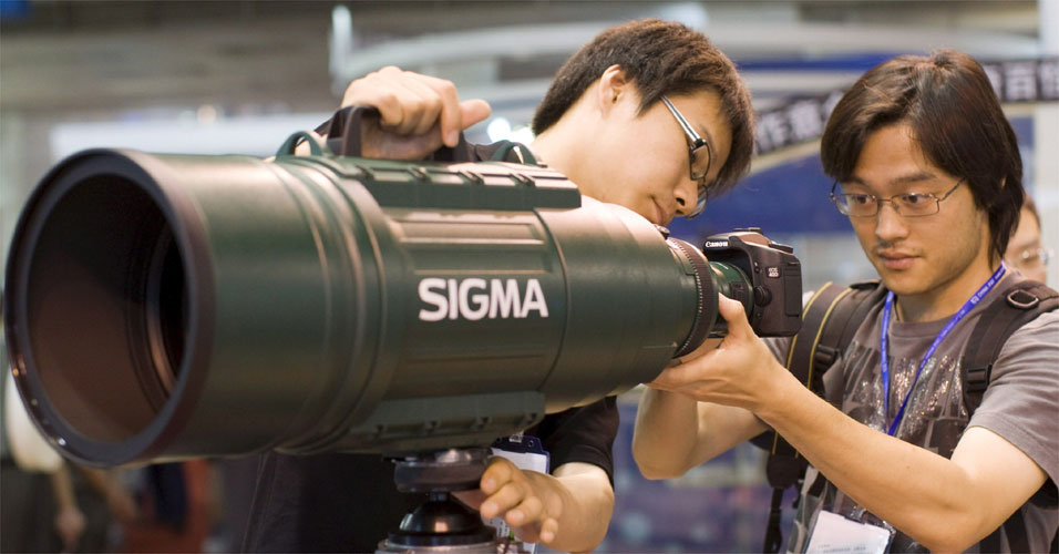 Chinês observa protótipo de uma lente teleobjetiva 200-500mm f2.8 de alta velocidade, da empresa Sigma. A China se tornou um dos maiores consumidores e produtores de equipamentos fotográficos do mundo, desde as câmeras mais básicas até as de formato profissional